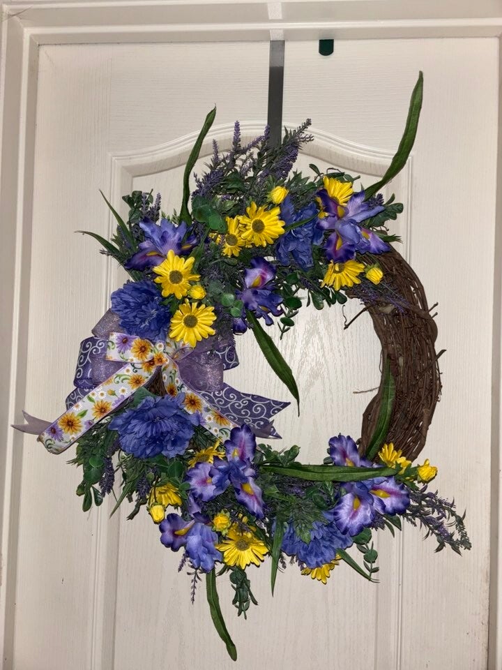 Handmade bow with purple and yellow floral arrangement on a grapevine wreath